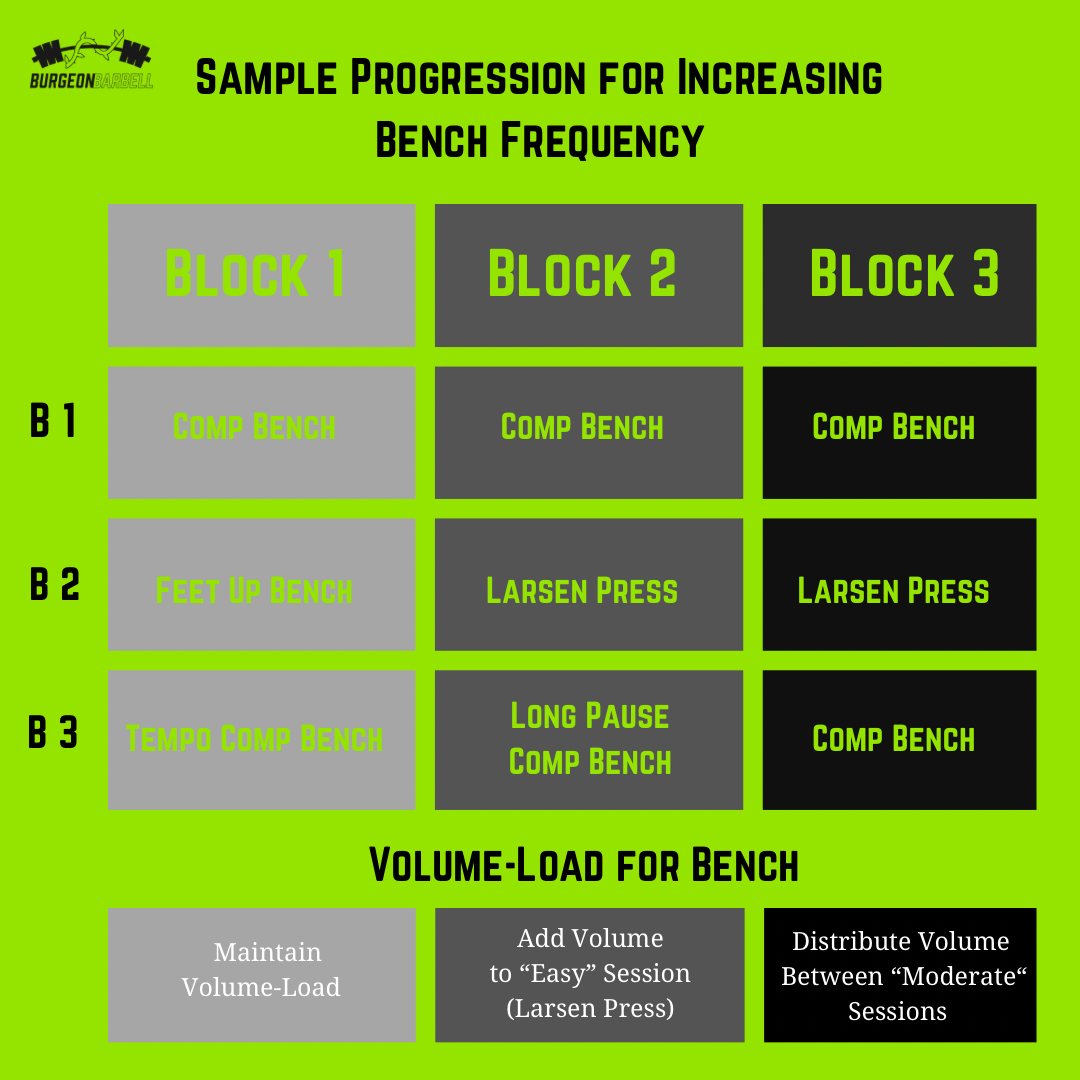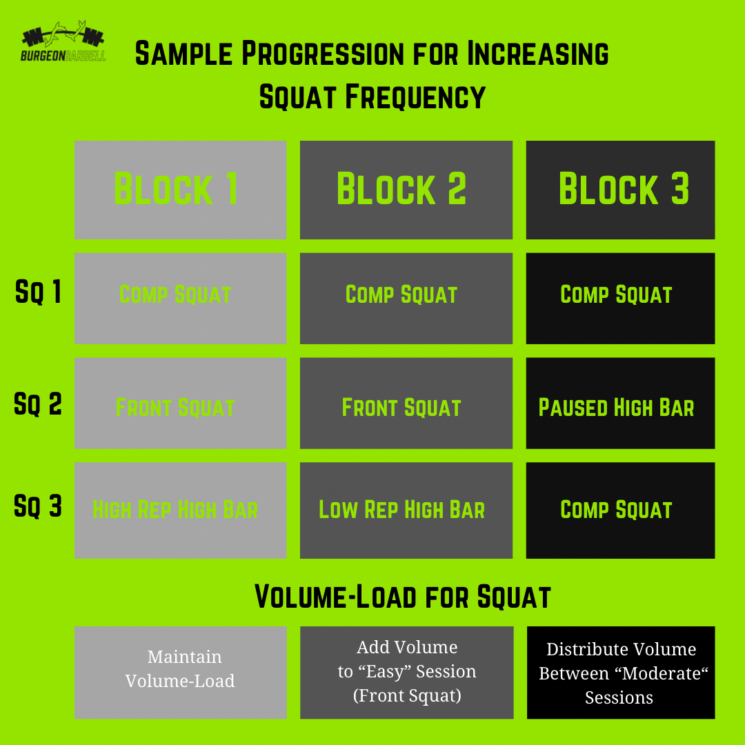 The main consideration when increasing frequency is adequate recovery between training sessions. Starting with a variation of the lift that inherently limits load (i.e. front squats, Larsen press, snatch grip RDL), can help with fatigue management.